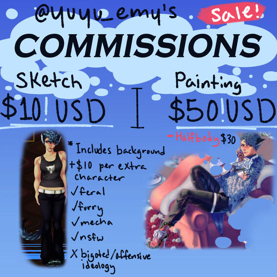 By paying the invoice you agree to the TOS.If I am not comfortable with your commission I have the right to refuse it. Ill behaviour from the client is unacceptable and the commission will be cancelled if it happens.A commission will usually take 3-4 weeks to finish. Wip/progress will be updated to the client regularly.Process: First the client and I (yuyu_emy), will discuss the terms of the commission and decide on a final price. Next, a sketch will be shown to the client and once the sketch is approved, payment is required in full before I, the artist, continue the work. After the commissioned artwork is completely finished, the files will be sent via email.Refunds available if: